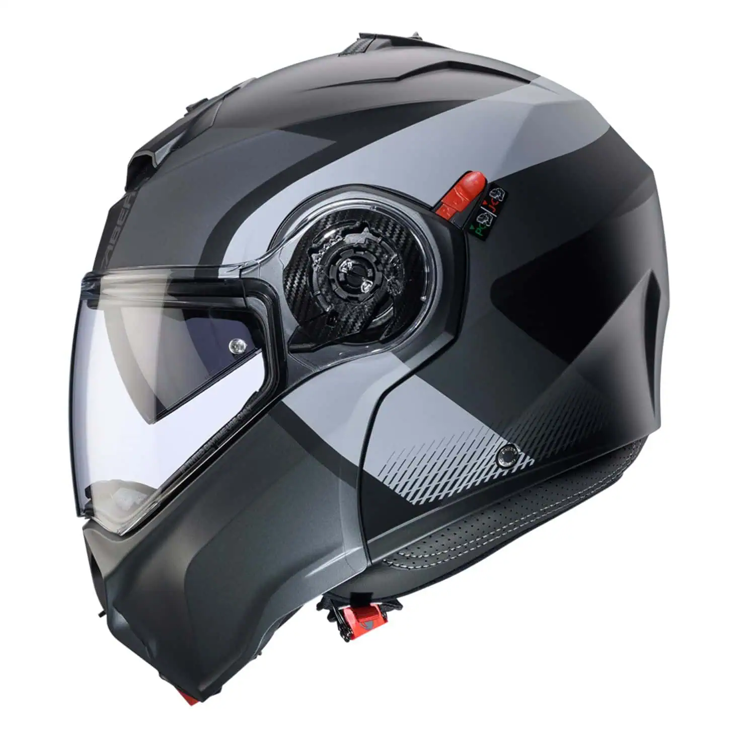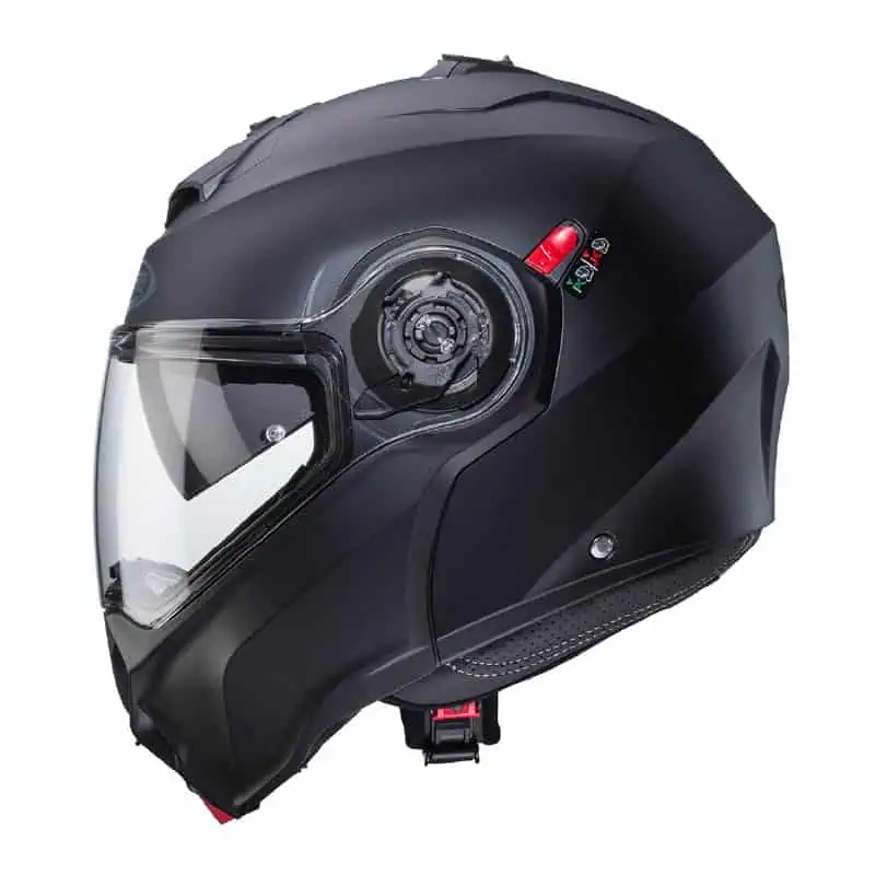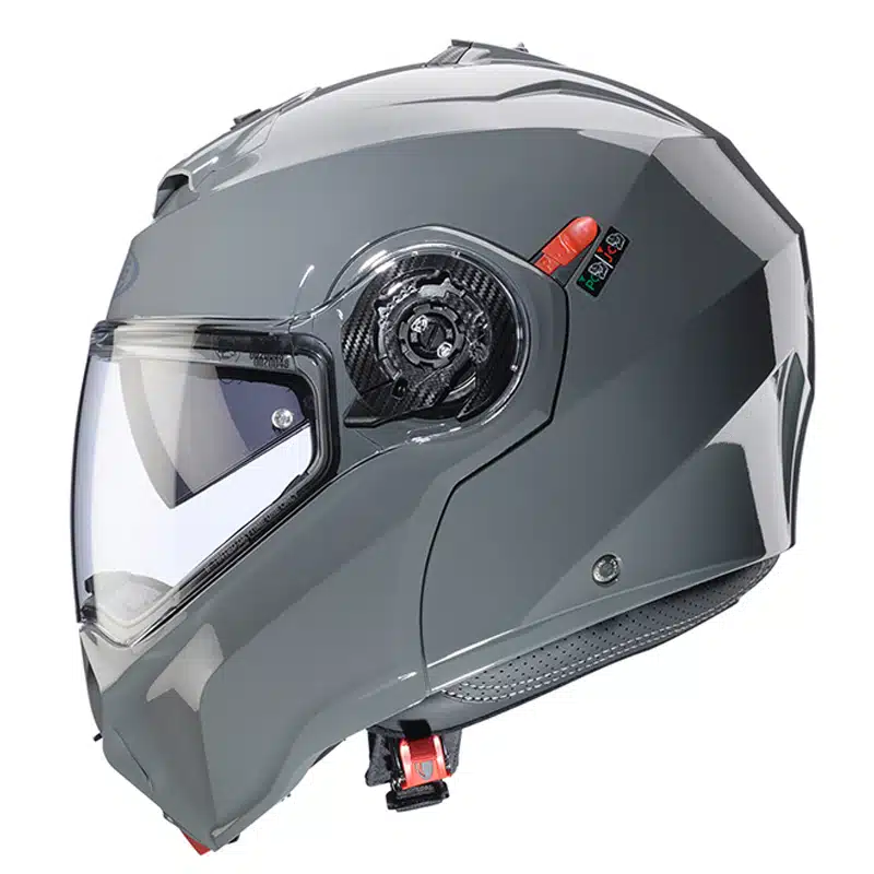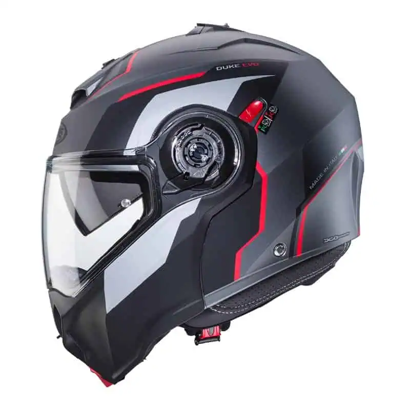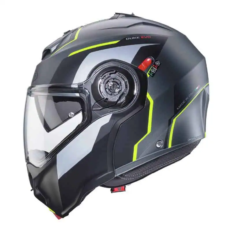 ל-CABERG DUKE EVO תקן כפול P/J וניתן להשתמש בה גם כקסדה סגורה (P) וגם כקסדה פתוחה (J) כאשר נועלים את מגן הסנטר במצב פתוח באמצעות מנגנון הנעילה.