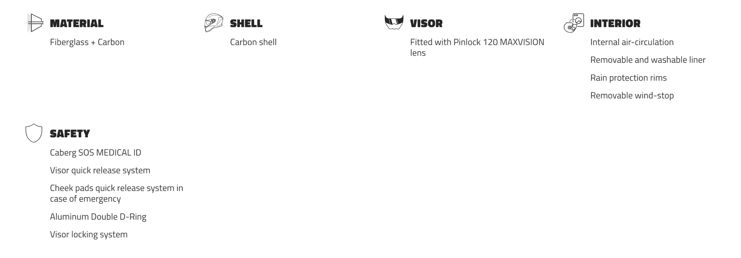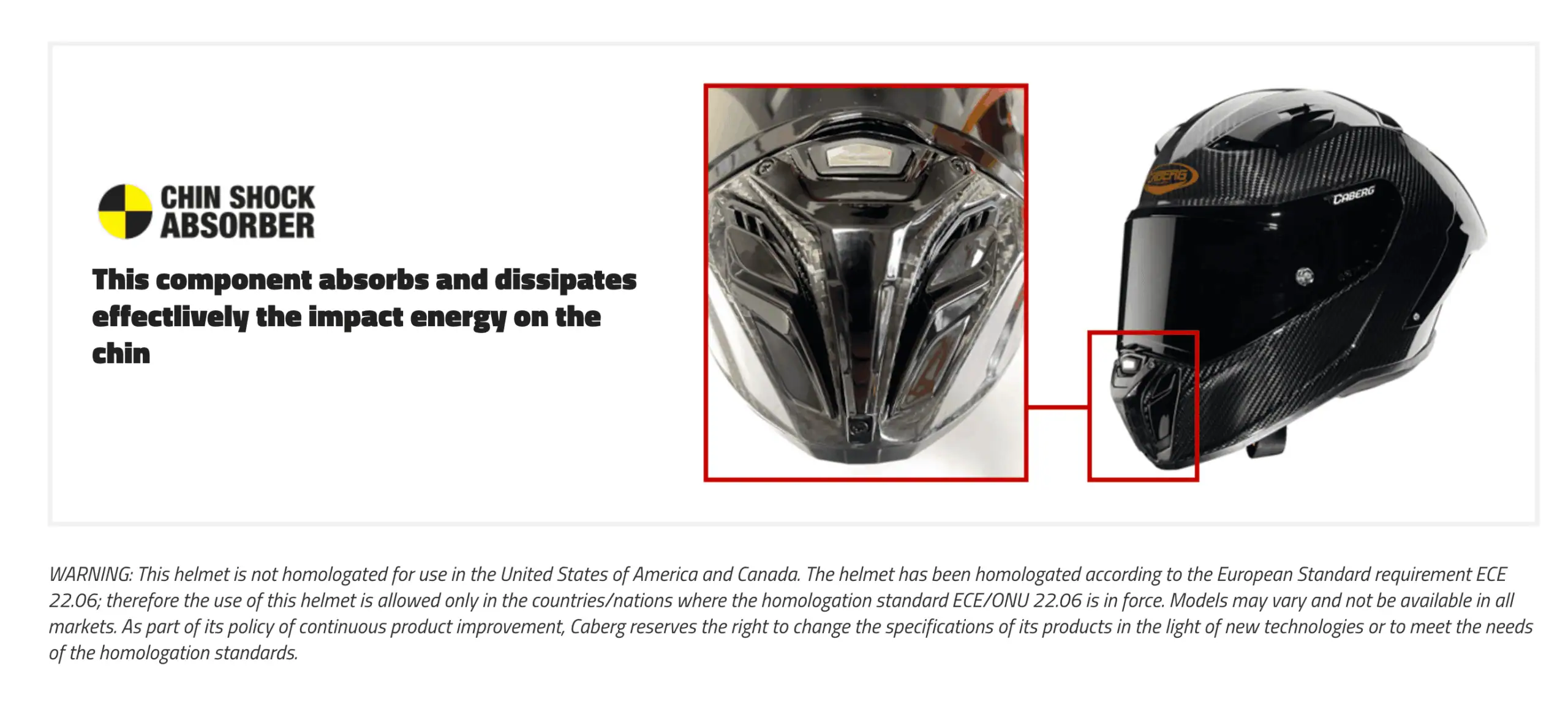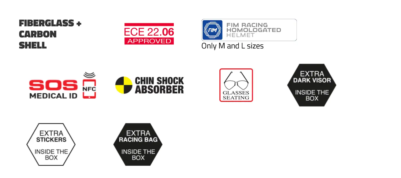 לקסדה מעטפת חיצונית מקרבון במידות קומפקטיות, ומגיעה בגדלים S עד L. היא מציעה רמת בטיחות גבוהה במיוחד, עם תקינה אירופית מחמירה* ECE 22.06 ואישור FIM ברמה 2 – מה שמאפשר שימוש באליפויות העולם.