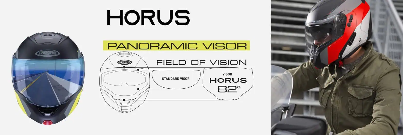ל- HORUS משקף אולטרה רחב המאפשר שדה זווית ראיה של 82° לרכיבה בטוחה ומהנה יותר והיא מגיעה עם שני משקפים (משקף שקוף + משקף שמש פנימי) וכן משקף למניעת אדים Vision PINLOCK MAX. ניתן לתפעל את שני המשקפים בקלות ובנוחות גם עם כפפות.