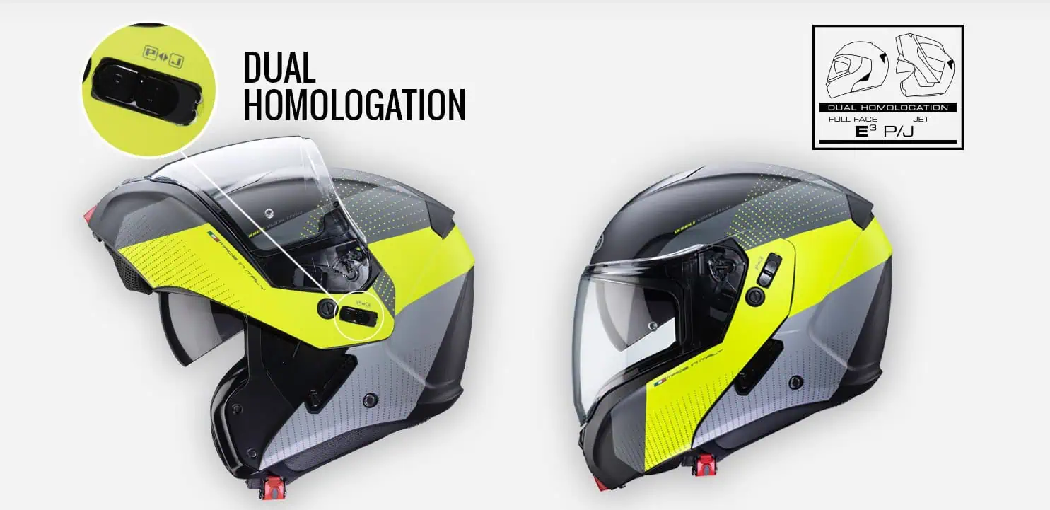 ל- HORUS תקן כפול P/J וניתן להשתמש בה גם כקסדה סגורה (P) וגם כקסדה פתוחה (J) כאשר נועלים את מגן הסנטר במצב פתוח באמצעות מנגנון הנעילה.